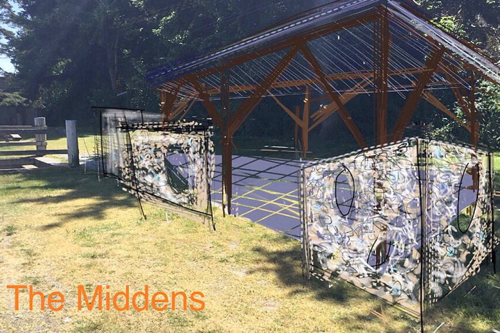 “The Middens” would be located at the east end, the widest area of the city-owned park. Oyster shells wired together would comprise the walls, meant to evoke oyster shell middens left behind by native people.