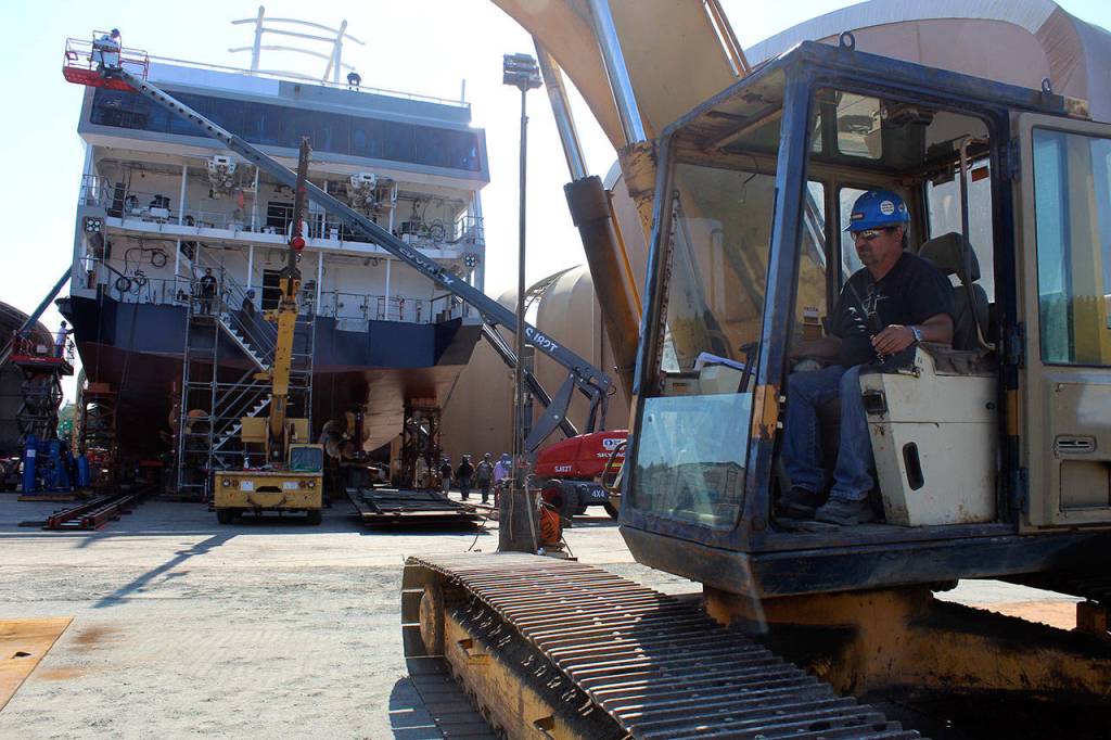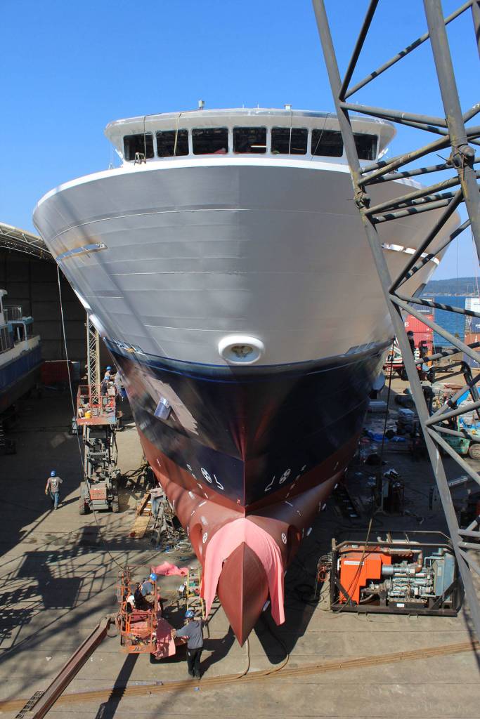 Thursday, the freshly painted blue and white “mini” cruise ship moved 85 feet sideways inside Nichols Brothers boat yard to get lined up on two tracks that compose a skid launch system.