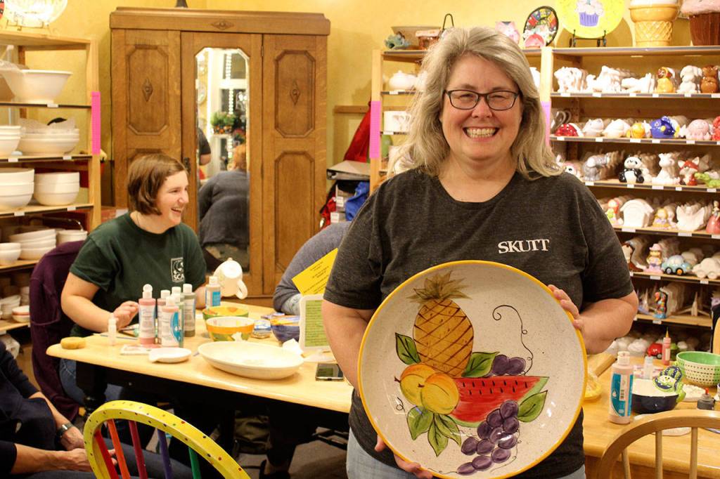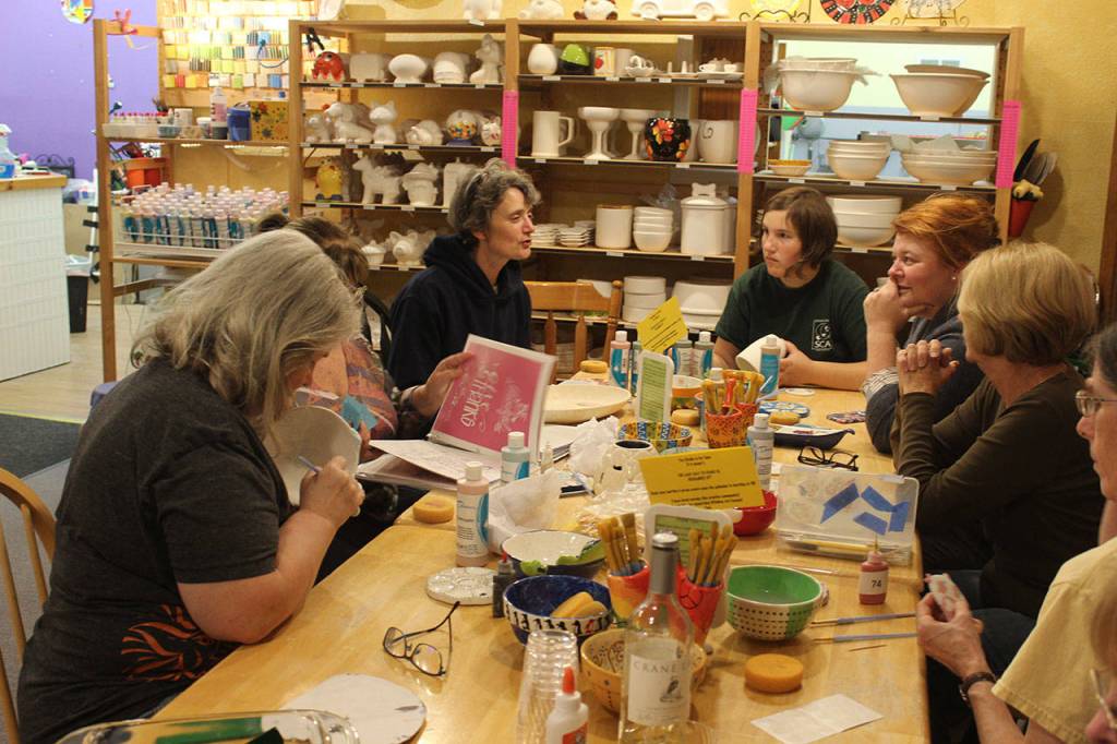 Whidbey Art Escape in Freeland has been the gathering spot every Wednesday night for a group of women who chat, laugh and relax while painting ceramic pottery or creating other art. Owner Tina Beard, left, is selling her business after 15 years. (Photo by Patricia Guthrie/Whidbey News Group)