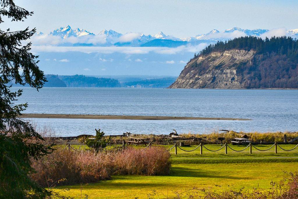 She raised her camera and took pictures of Sunlight Beach with Double Bluff and the snow-capped Olympic Mountains in the background.