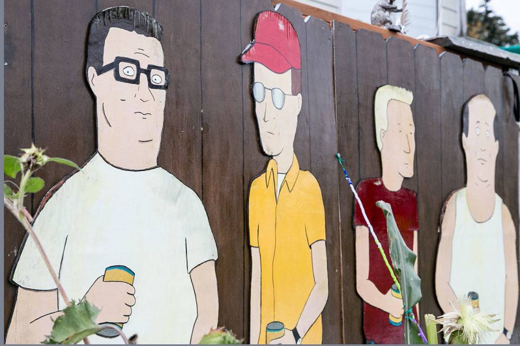 Kelly Hatley, 63, proudly displays characters from “King of the Hill” in Freeland on Whidbey Island. (Kevin Clark / The Herald)