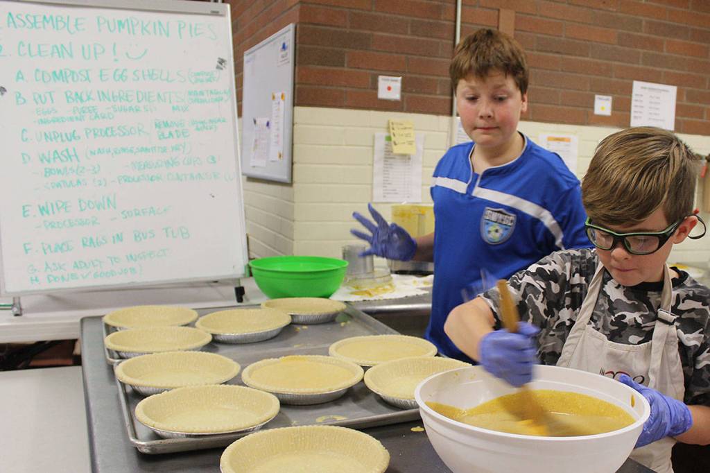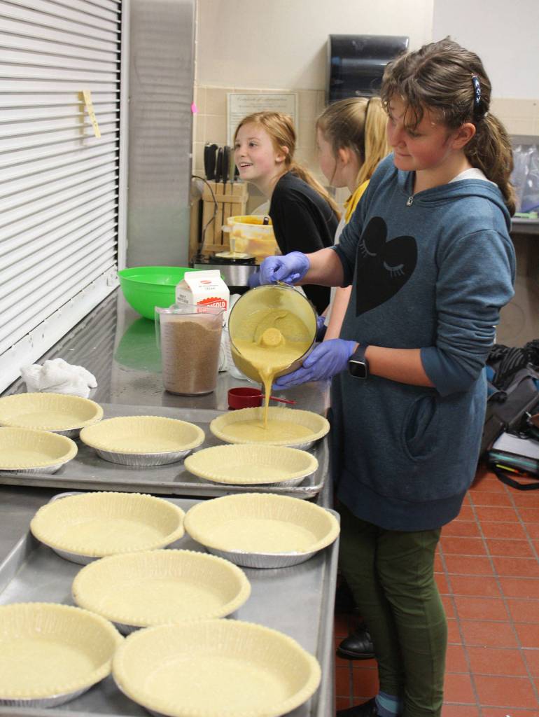 “I’m in charge of breaking eggs,” said Wyatt Embleton working alongside Weston Klamm. The fifth-grade boys were the smallest team but developed a rhythm mixing eggs, cream, pumpkin puree and the sugar/spice mix before filling up pie crusts.