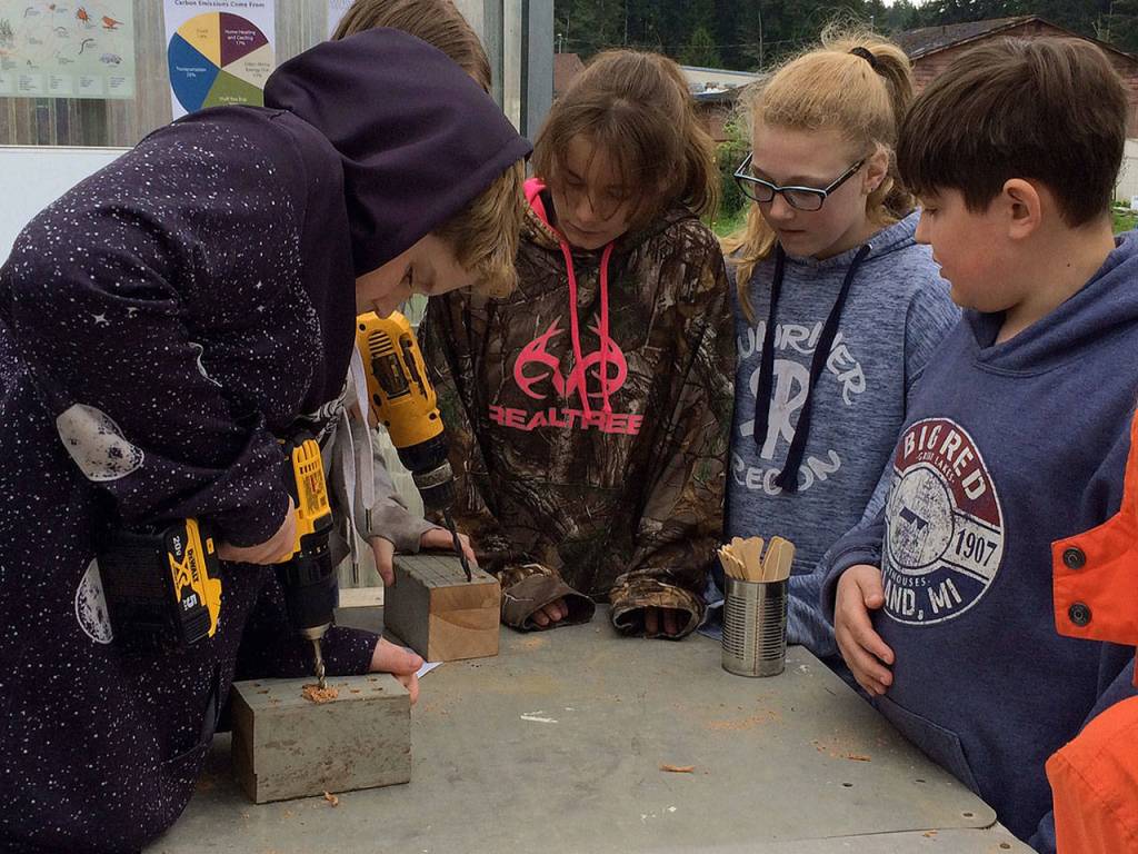 Susan Prescott from South Whidbey Tilth taught students about the importance of pollinators and the difference between mason bees and honey bees. Students then tried their hand at making mason bee boxes.