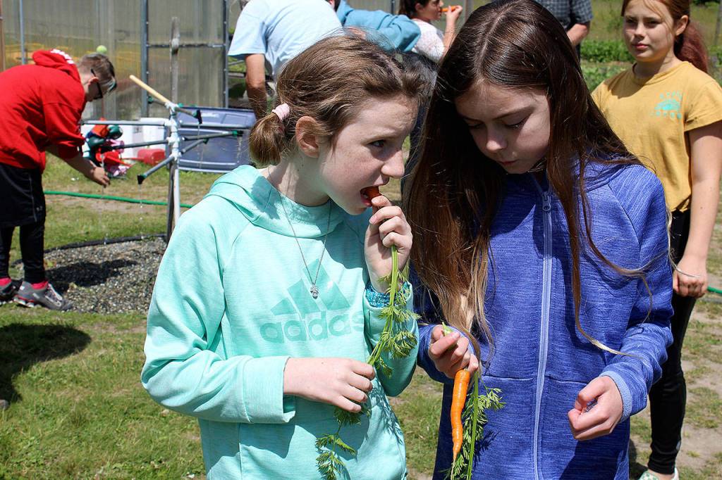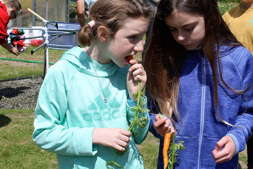 Munching on carrots they just picked and washed are fifth-graders Callahan Dobmeier (left) and Emily Reid. They are the first class to experience farming and culinary classes during every elementary grade. Photo by Patricia Guthrie/Whidbey News Group