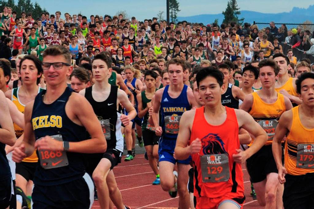 Competing in the largest meet in the Pacific Northwest and against some of the best teams in the region, the South Whidbey High School cross country team rose to the occasion at the Hole in the Wall Invitational at Lakewood High School Saturday, Oct. 12.