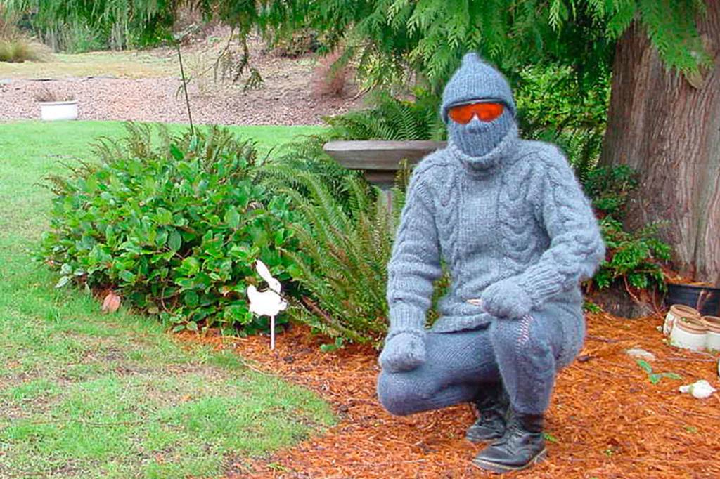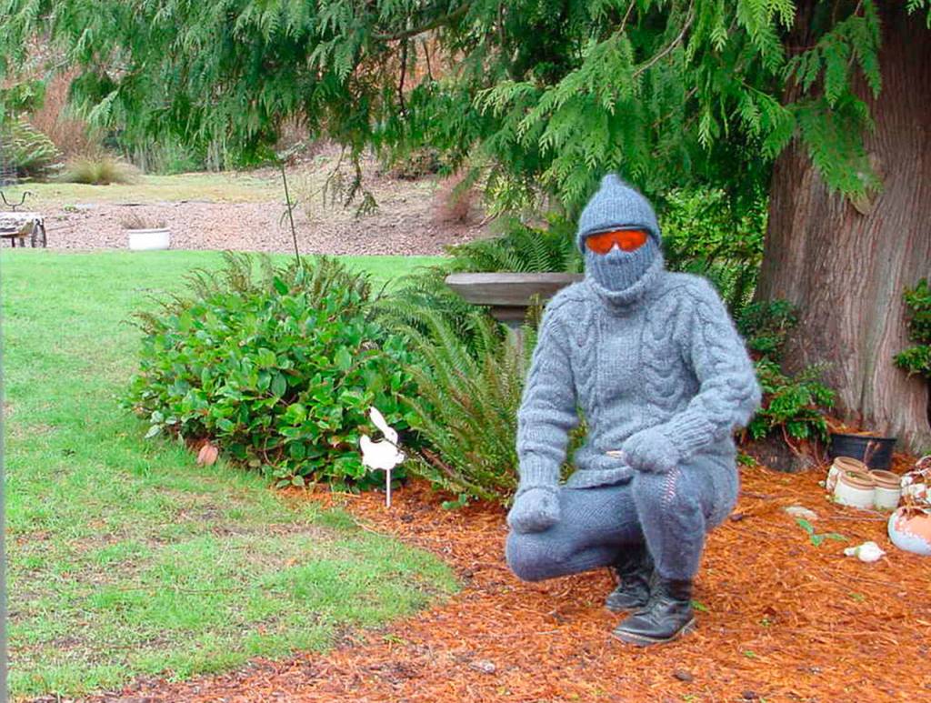 If for no other reason, it’s a rare chance to meet Paul and Naomi Magnusson, a long-time Whidbey couple who’ve spent decades of their lives perfecting the art of knitting – and raising it to cult status. Paul, the more audacious member of the power-knitting twosome, has been known to create head-to-toe outfits, such as a full camouflage suit made of Lopi wool yarn from the fleece of Icelandic sheep. Of course, he modeled it himself in a jungle-like forest of canopied trees.