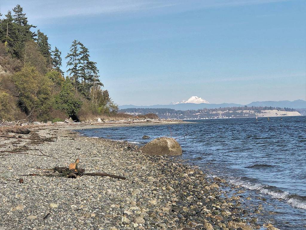 As you step from the forested hillside onto the beach, you immediately become aware of how isolated it seems. All you hear is the quiet lapping of waves. All you see in either direction is a long expanse of beach, backed by feeder bluffs topped with mature evergreen trees. On a clear day, you can see Mount Baker in the distance.