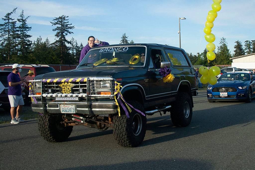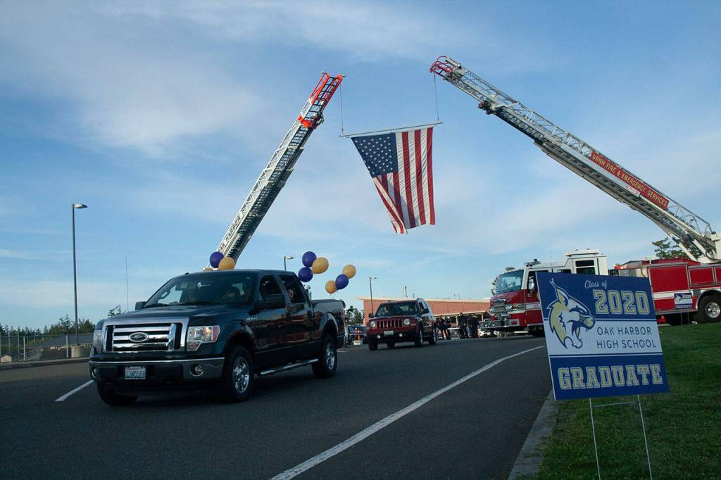 Instead, they turned on their emergency lights to honor the students of the Oak Harbor High School class of 2020, who drove their cars around the school in a mini parade.