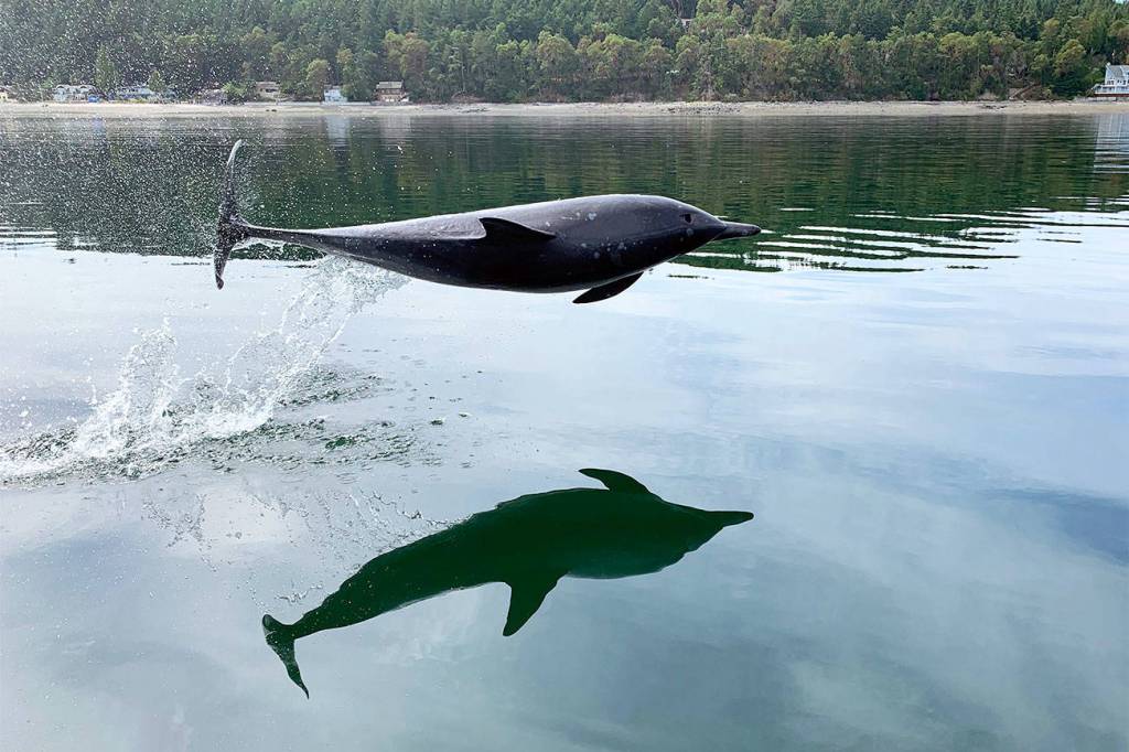 The dolphin seen in Penn Cove is a male named Cinco. He has been seen with two other dolphins before in south Puget Sound but recently was spotted alone further north, she said.