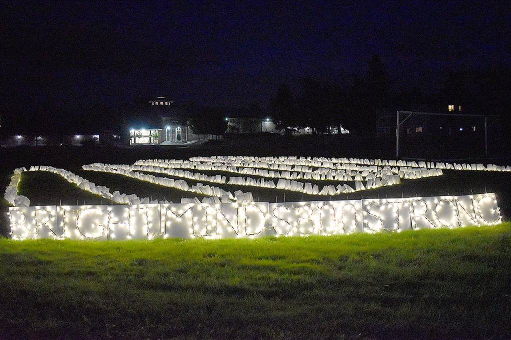 The 800 lights were up for three hours on the athletic field as cars zoomed by on State Highway 20. Volunteers laid out strings of lights, which were covered by white paper bags, and built a sign facing the highway that said: “Bright minds, 800 strong.”
