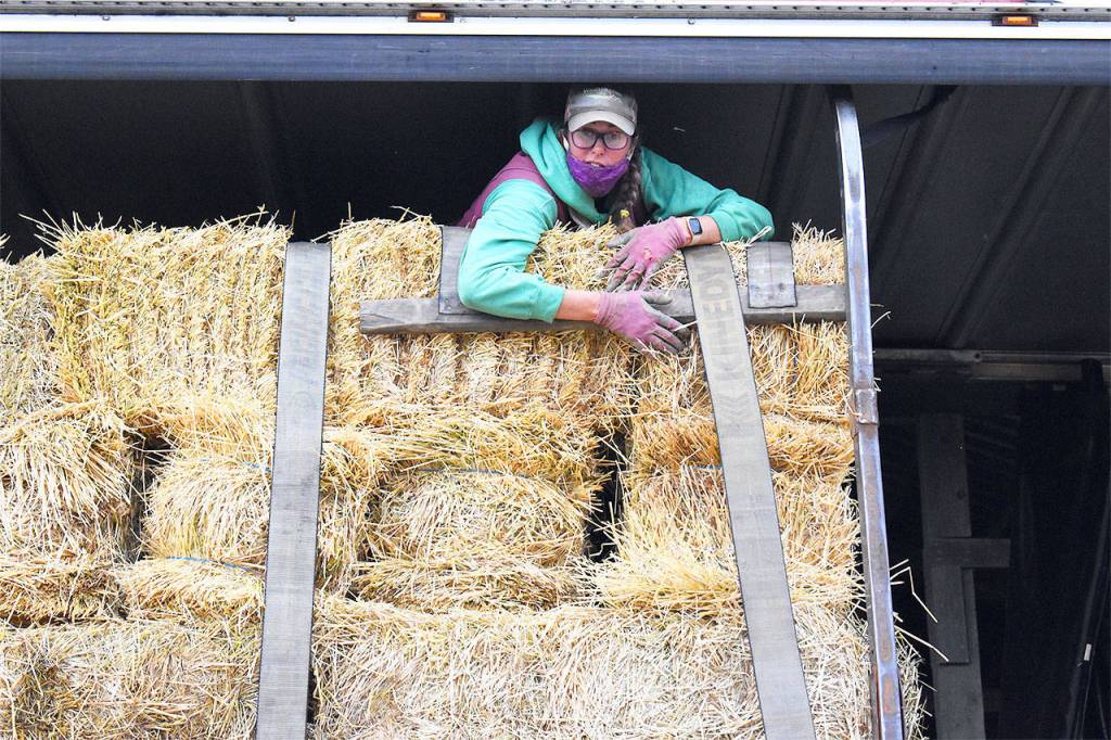After volunteers stacked hundreds of 80-pound bales of hay on the trailer at Sherman Farms in Coupeville, driver Mike Hamilton drove south to pick up hundreds more at Maxwelton Farm in South Whidbey.