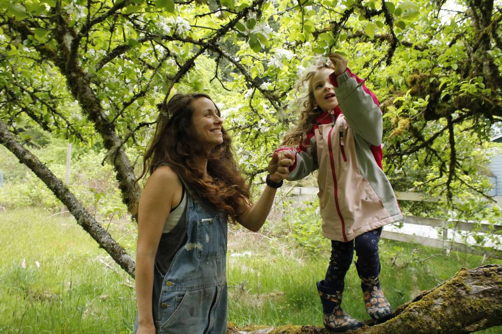 Aja Stewart and her daughter Rainey, 4, search for bees in a tree in bloom at Sweetwater Farm in Clinton. (Photos by Kira Erickson/South Whidbey Record)