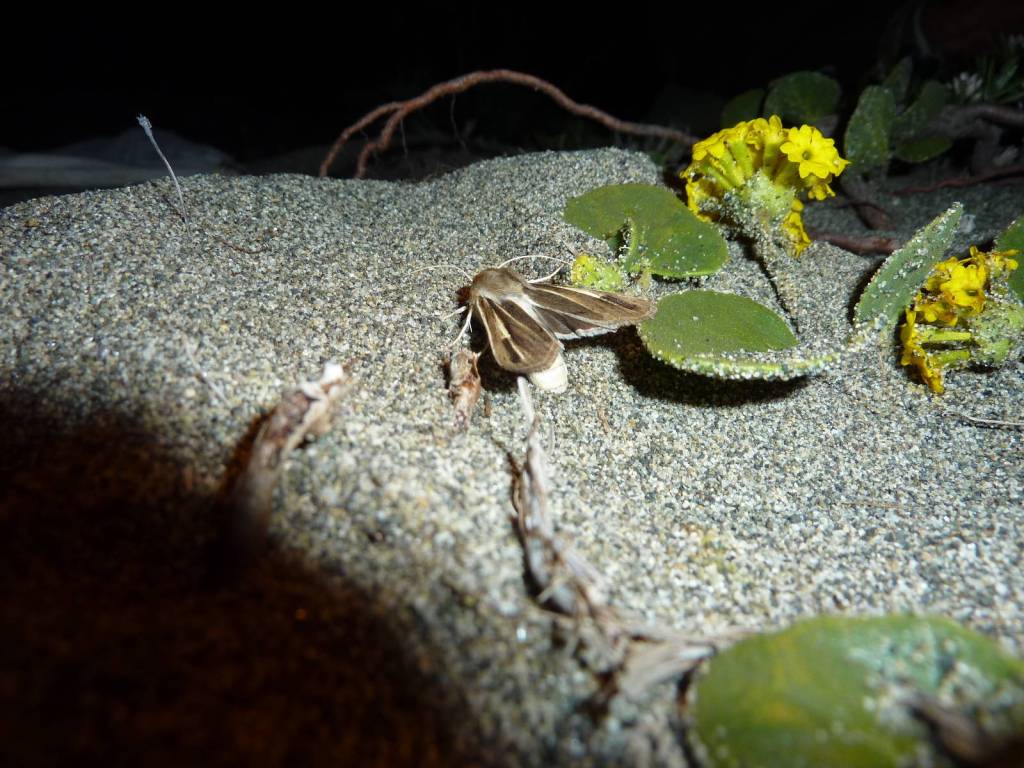 The 1.5-inch moths live in sand dune habitats with a lot of yellow sand-verbena, a plant that grows in succulent mats, needs saltwater to survive and attracts sand into its body to make it hard for herbivores to eat.