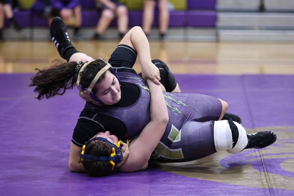 Oak Harbor High School senior Gabriela Suarez Flores competes at the senior night wrestling meet Jan. 12. Both the girls and boys wrestling teams are heading into the last two weekends of the regular season. The post-season begins Feb. 4 with sub-regions.