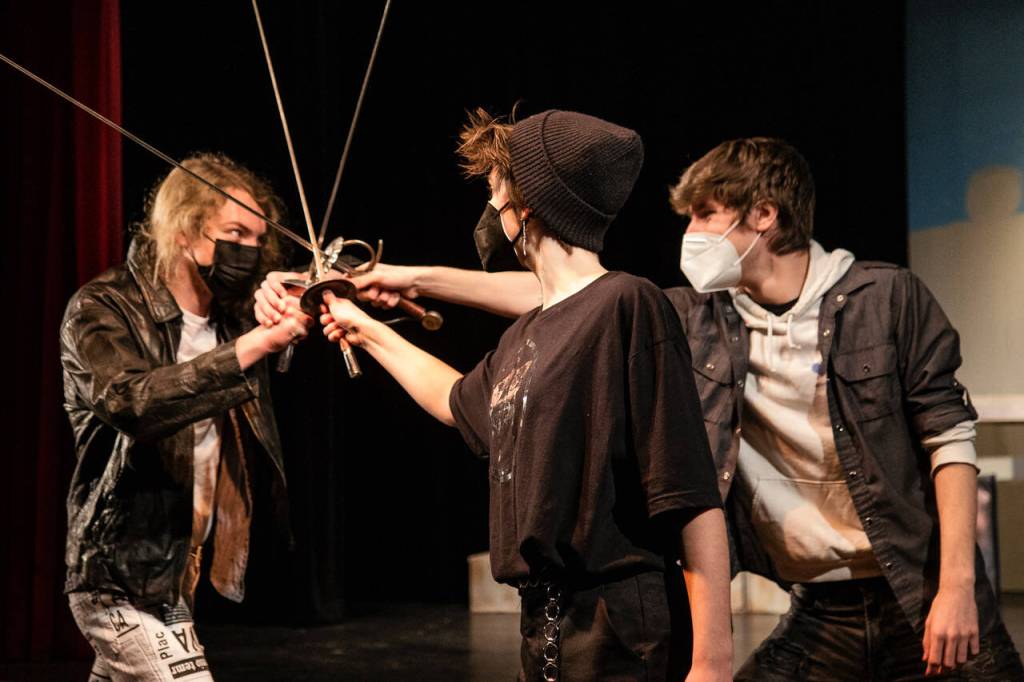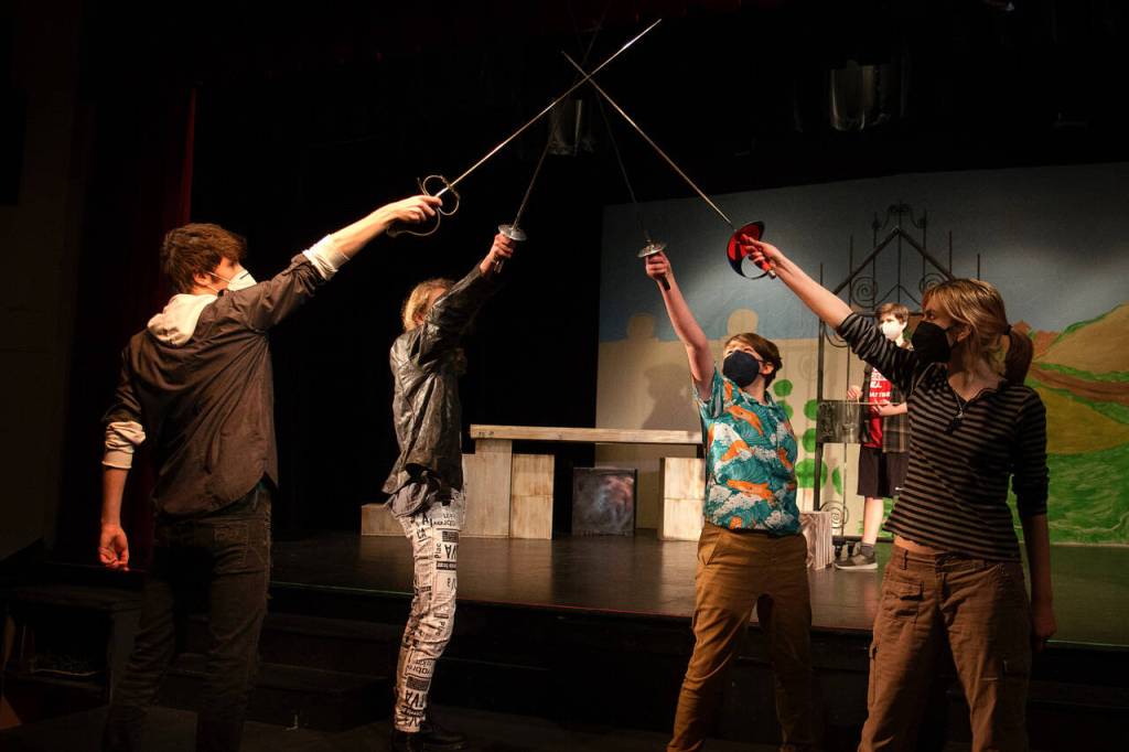 Actors are equipped with epees, rather than wooden swords that the theater has used in past productions.