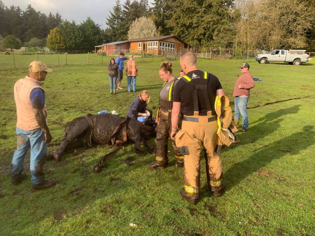 According to Deputy Chief Terry Ney, South Whidbey Fire/EMS responded to the scene just before 4 p.m. at the request of the Island County Sheriff’s Office. The crews arrived at the field off of Maxwelton Road to find the bovine submerged in a mucky spot.