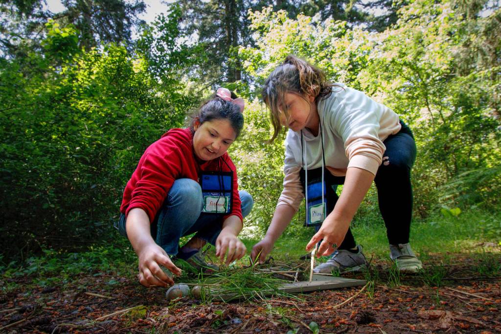 Stanley’s fourth grade class from South Whidbey Elementary School spent the day scanning their surroundings for feathery friends with binoculars made out of toilet paper rolls and duct tape, pretending to catch prey with different tools mimicking beaks, building nests out of natural materials and lining up to touch stuffed fowl.