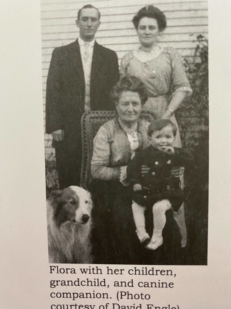 Flora Pearson Engle sits for a photo with her children, grandchild and dog.