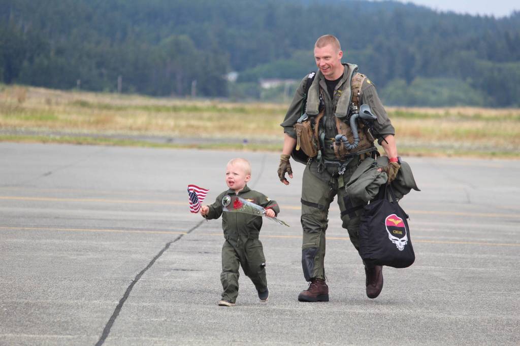 Twelve aircrews and six jets with the Electronic Attack Squadron 133, the “Wizards,” were welcomed back to NAS Whidbey on the afternoon of Aug. 9 by friends and family members waving signs and children dressed as pilots pointing excitedly at the incoming planes, some already squealing for “Daddy” the moment the jets came into view.
