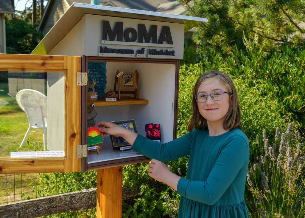 DiRienzo said she wants to have a new exhibit every month at the new gallery. She hopes the tiny museum might inspire others on Whidbey Island to create their own. As far as she knows, the Langley MoMA is the first of its kind on the island. It’s located outside her home, a few feet away from her neighbor’s Little Free Library. Her neighborhood is a popular, pleasant spot for walking.
