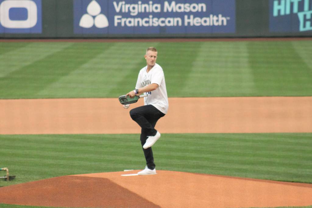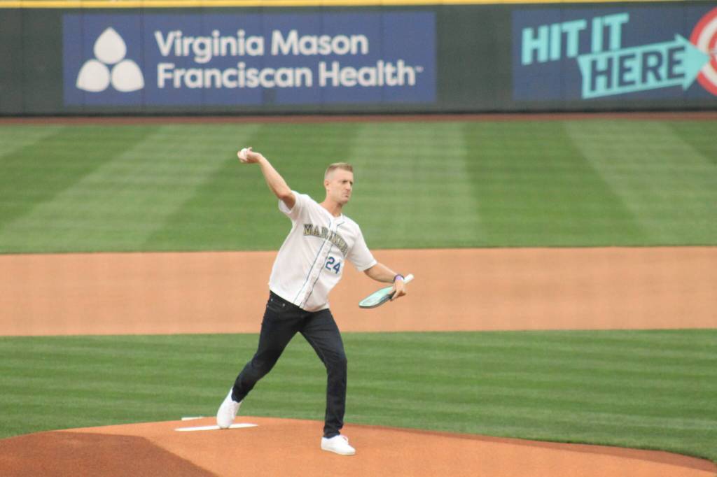 Riley Newman, 2011 South Whidbey High School alum and pickleball star, threw out the first pitch at Saturday night’s Mariners baseball game.
