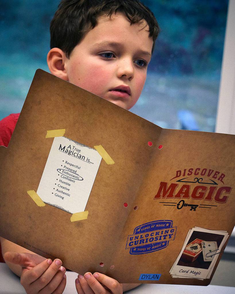 Russell teaches through Discover Magic, an international program that provides kids with a kit of materials to perform their own tricks. Lessons subtly build character, confidence and communication skills, all useful tools for the real world. Russell, for example, always asks his students to stand up and introduce themselves to the room.