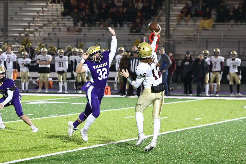 Oak Harbor senior Cameron Reyes reaches for the ball at the Nov. 4 game against Lakewood. The Oak Harbor varsity football team lost their home non-conference game against Lakewood with a score of 14-12. The team is 2-8 overall so far this season.