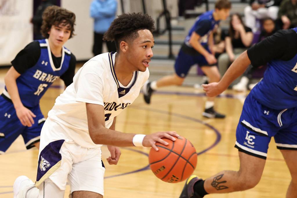 Oak Harbor athlete Aliyis Giles dribbles down the court at a Dec. 2 game against La Conner. Oak Harbor defeated La Conner 73-44 in the first game of the season.