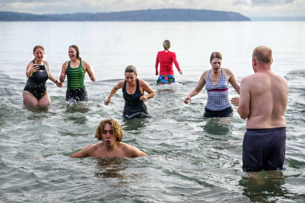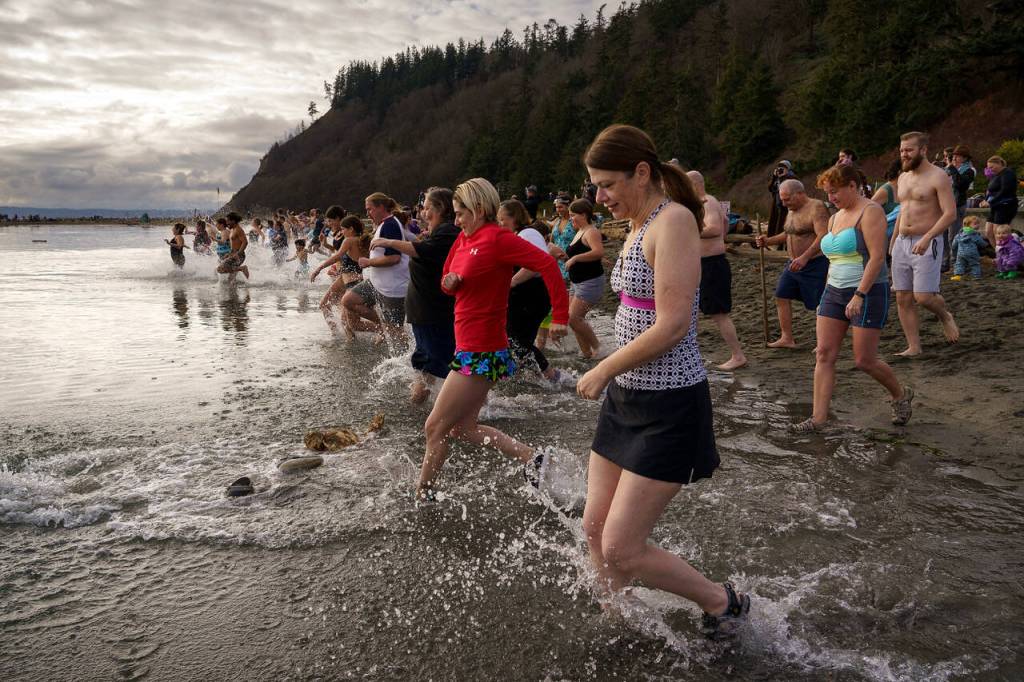 People of all ages rang in the new year by taking an icy dip in the waters of Double Bluff Beach in Freeland on New Year’s Day.