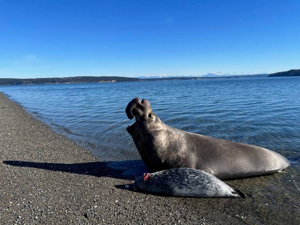The 2,000-pound pinniped attracted a few curious neighbors to a Central Whidbey beach, where he had dragged a harbor seal ashore after killing it. Jan Skewes snapped some photos of the behemoth looming next to the smaller seal body at the water’s edge. She said he threw his head back and roared triumphantly, exposing his formidable teeth.