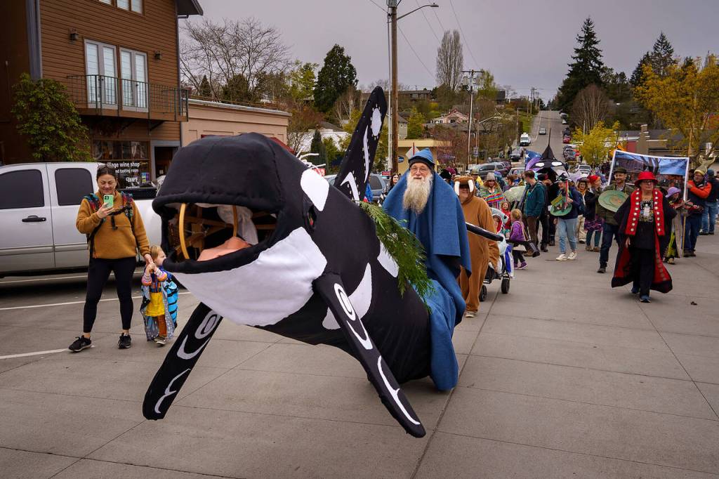 The parade, which had significantly more turnout this year, began in 2004 as a small event. It is purposefully scheduled during the time of year that a group of gray whales known as the Sounders are returning to Puget Sound and can be seen feeding on ghost shrimp around Whidbey Island.