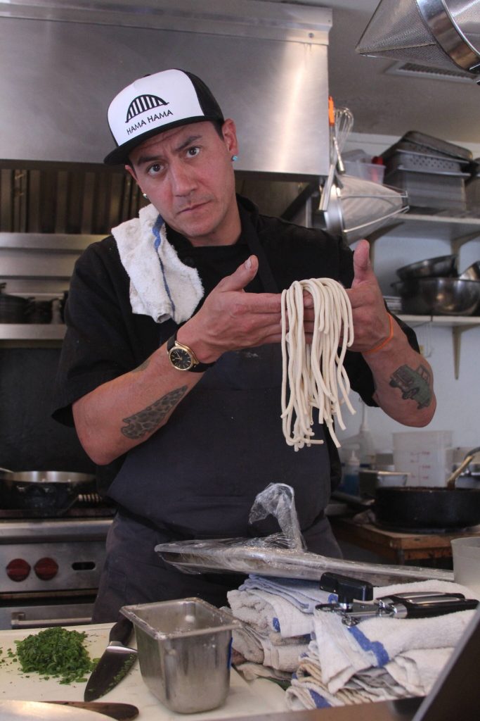 Jones shows off pasta made from scratch.