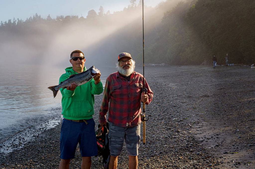 Roland Gobel has success while fishing for salmon at Bush Point with his father Kelly, who is visiting from California. (Photo by David Welton)