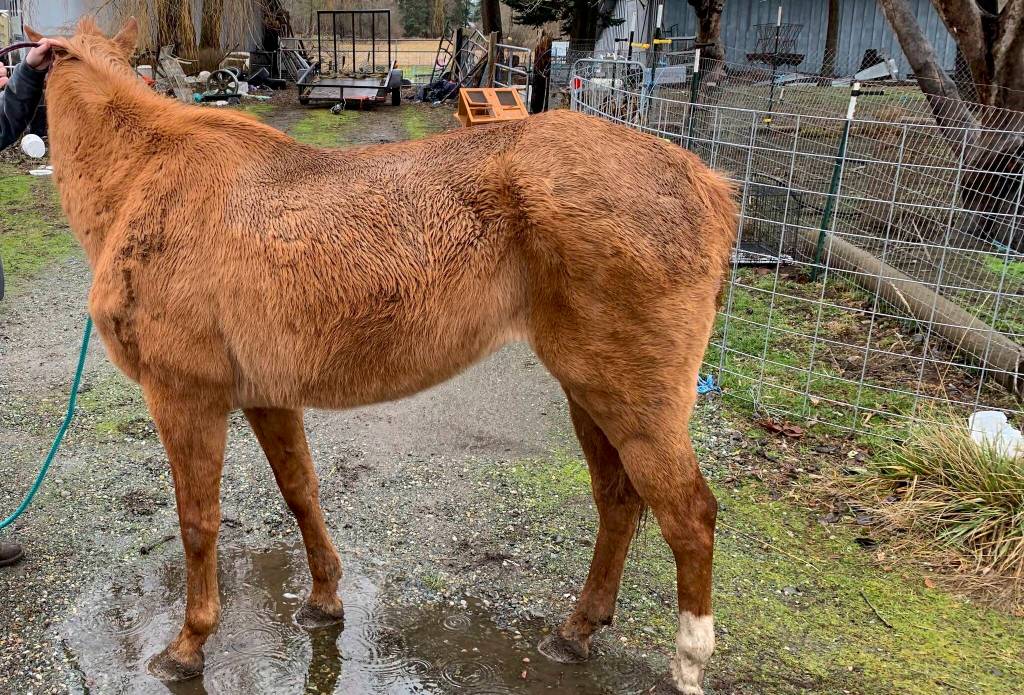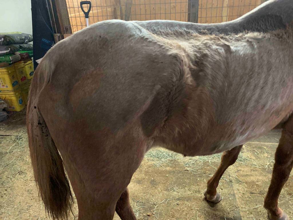 In addition, the veterinarian found that all the horses were below the ideal weight and many had teeth problems, overgrown hooves and high parasite loads. One female horse was extremely emaciated; a male was very thin with severely atrophied muscles; and another female was very thin with generalized muscle atrophy and urine scalding down her back legs. Three mares were pregnant.