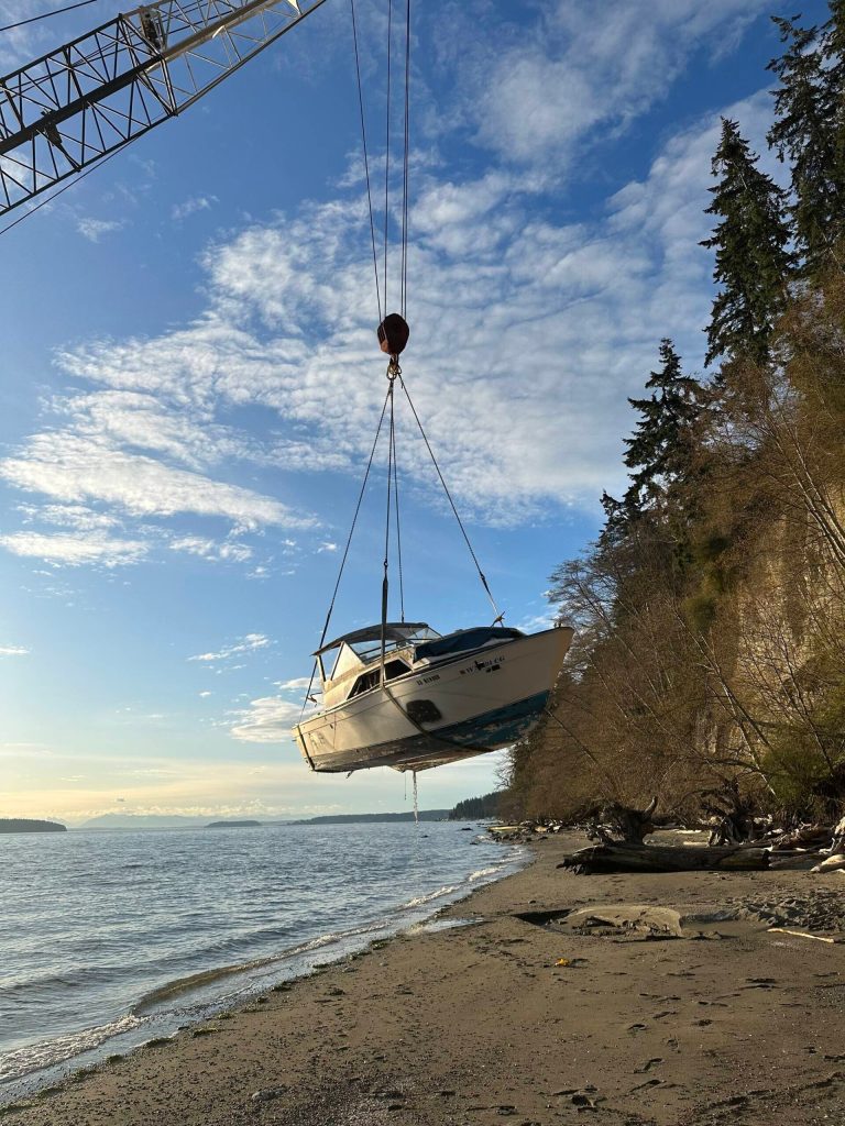 The Washington State Department of Natural Resources and the Island County Marine Resources Committee coordinate to remove derelict vessels from the Whidbey Island shoreline.