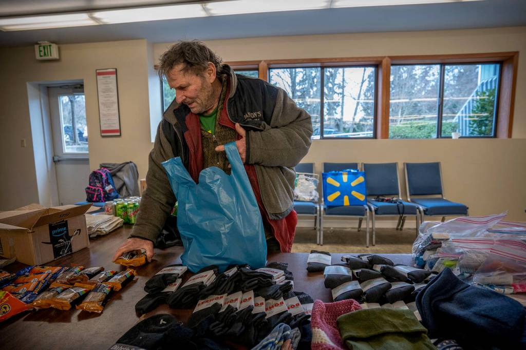 Jon Kosa stopped by Island Church to try on a pair of shoes. He lives in a nearby encampment with eight others, who preferred to stay away, and he gathered supplies to bring back to them.