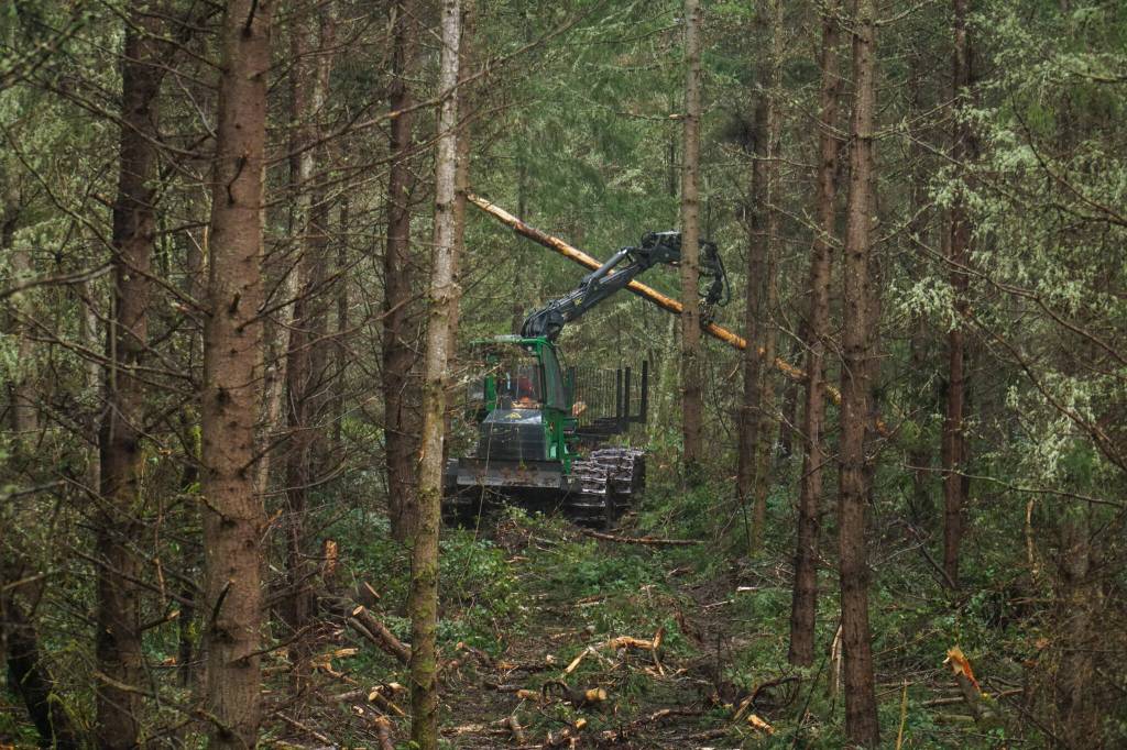These loggers no longer use chainsaws, said Land Trust Stewardship Director Jessica Larson. With the feller buncher, a central operator can snag a tree by its base, cut it, clean it and stack it all in a single motion.