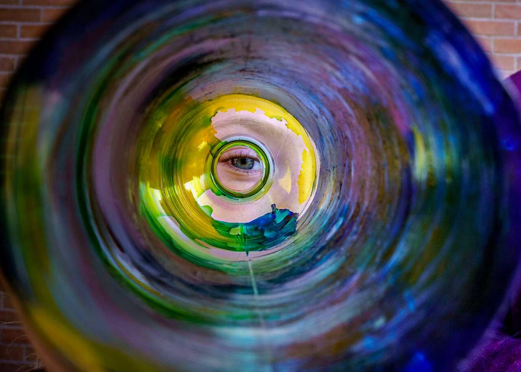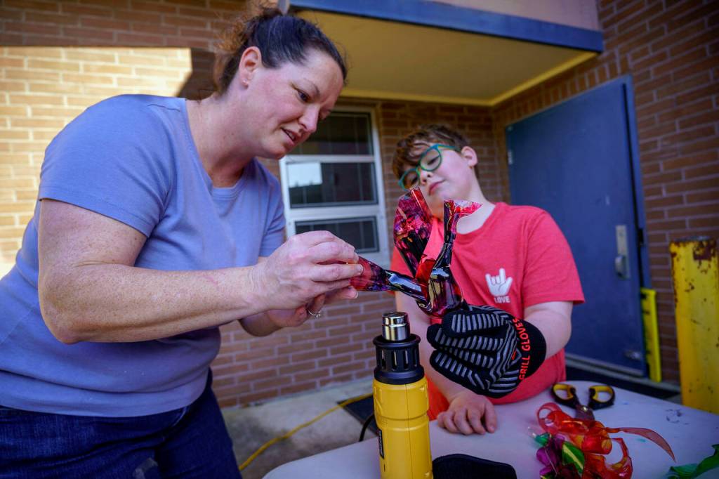 On a recent afternoon, kids enrolled in the South Whidbey Alternative Learning Experience, or ALE, used cotton swabs to spread drops of paint around the inside of plastic water bottles. With the assistance of art teacher Denice Bochantin, they cut the bottles into strips and heated the shards, which caused the plastic to shrink and curl.