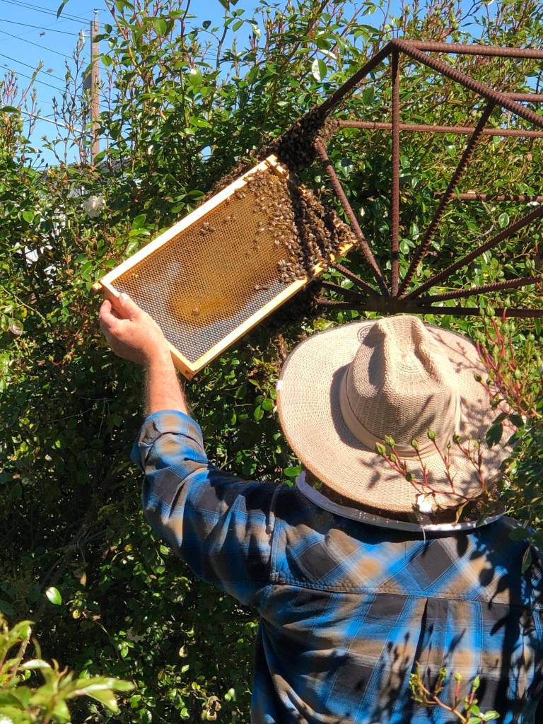 As the bees moved in, Teresa asked a beekeeping friend what to do and was directed to Bruce Eckholm of Eckholm Farm in Coupeville, where he keeps 40 honeybee hives. Apparently, the problem is common in the beekeeping world, and they’re used to helping each other out. Eckholm showed up shortly donning beekeeping gear and holding boxes tainted by honeycomb to lure the swarm.