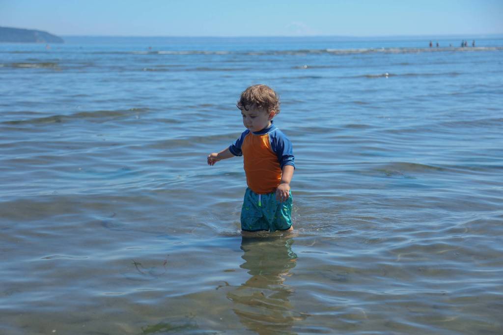 Toddler Kainoa Hagen-Ashe wades in the surf at Double Bluff Beach, July 9. (Photo by Caitlyn Anderson)