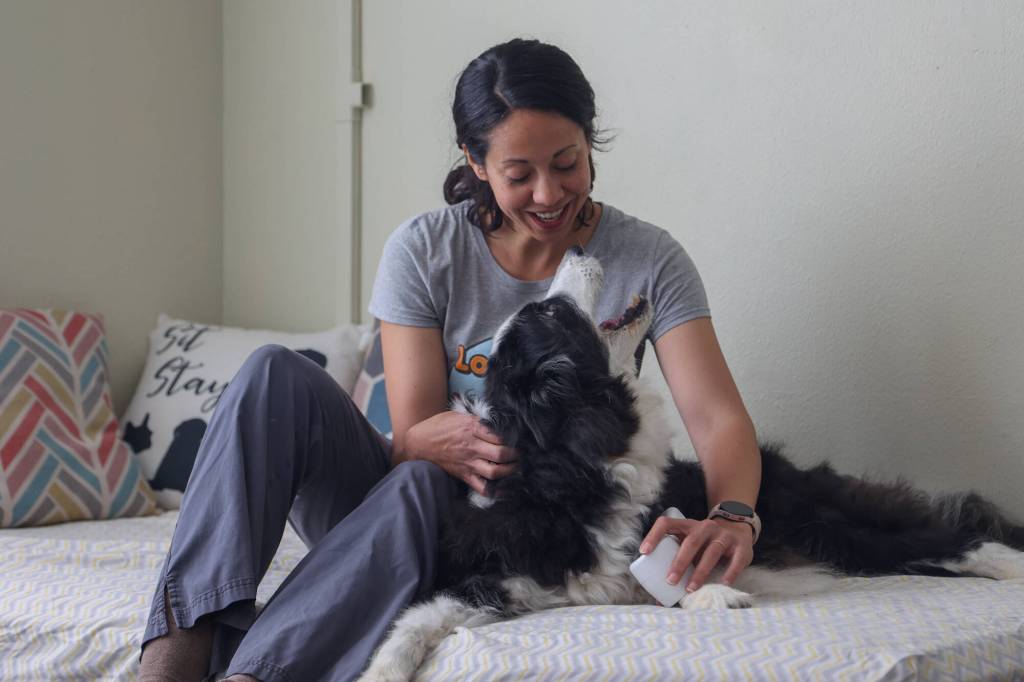 From his comfy position on a twin bed mattress, Piper quietly woofed in affirmation during his massage and laser therapy, living up to his name as a talkative dog, Larry said. In his younger days, Piper damaged both anterior cruciate ligaments while racing the neighbor’s dog. He wears a Velcro brace on all four legs, and walking on slippery floors or stairs is a challenge.