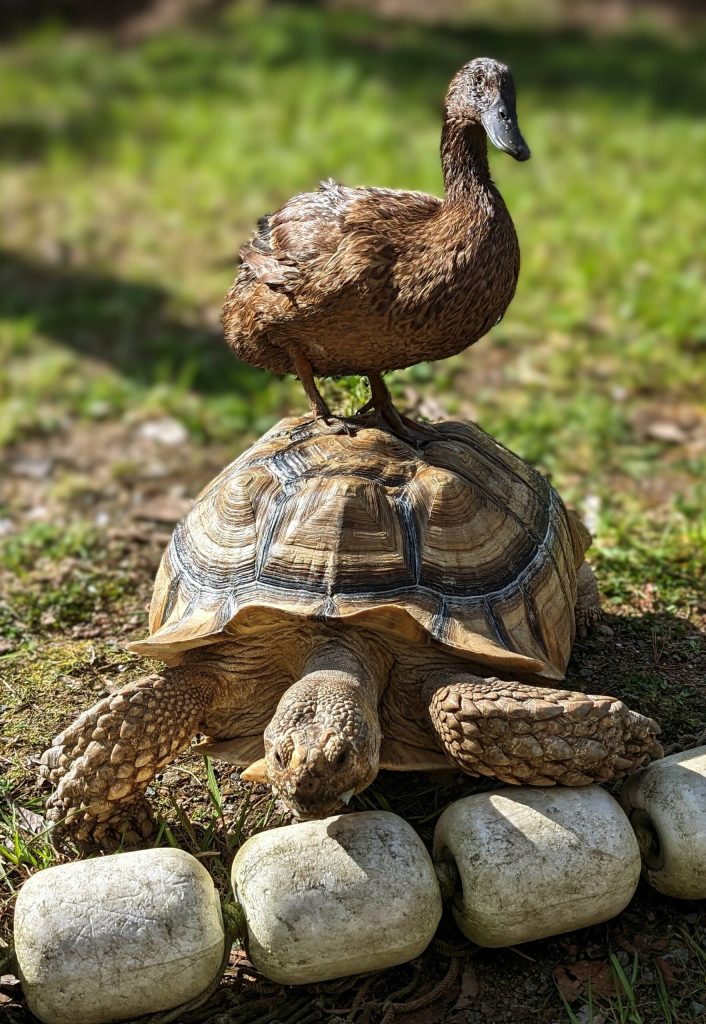 Móle has met Raja before and even posed for a photo while standing on top of his shell. The two rescue organizations often work together, sharing resources and referrals.