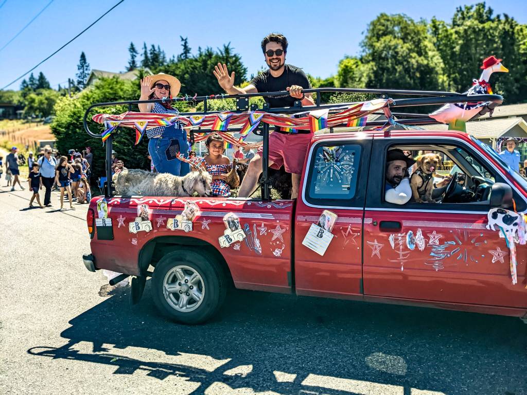 Rescue goats Yodelai and Blueberry, who just participated in the Maxwelton Fourth of July Parade, are excited to be part of the petting zoo.
