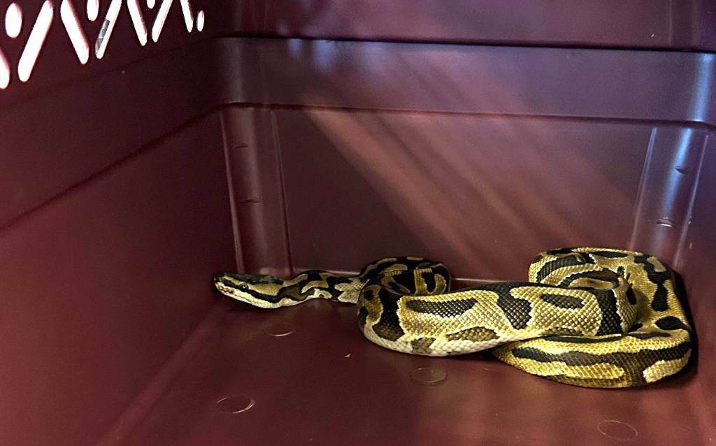 Esparza responded to the call. She said she was expecting to find a garter snake, which are native to the island, but was surprised to see that it was a ball python, a nonvenomous constrictor from Africa. At two feet long, it’s just a little guy in the python world. She estimates the snake to be about a year old.