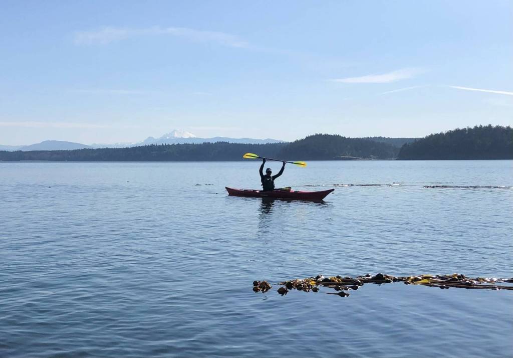 At the surface, Island County bull kelp monitoring project lead Carter Webb guides his team around the forest’s perimeter, kelp blades tickling the base of the kayaks. It’s early, and Webb is collecting data for depth, temperature and size of the forest to see how it’s changed from last year and how that has impacted the countless animals relying on kelp — a list humans are at the top of.