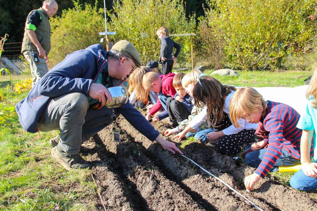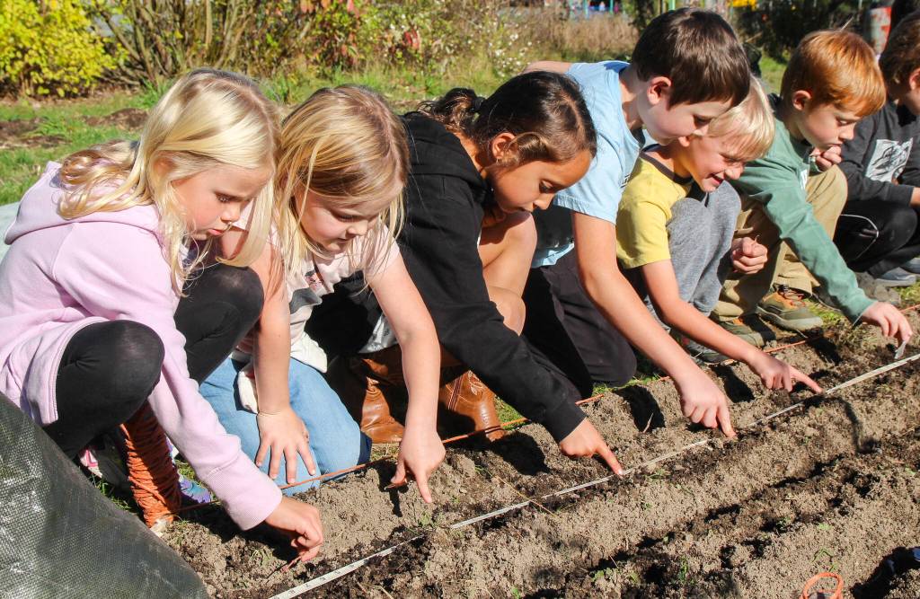 Hunched over the soil on a bright October day, a class of first graders put their measuring skills to the test at the School Farm by evenly spacing out the garlic cloves and giving them plenty of soil to grow in.