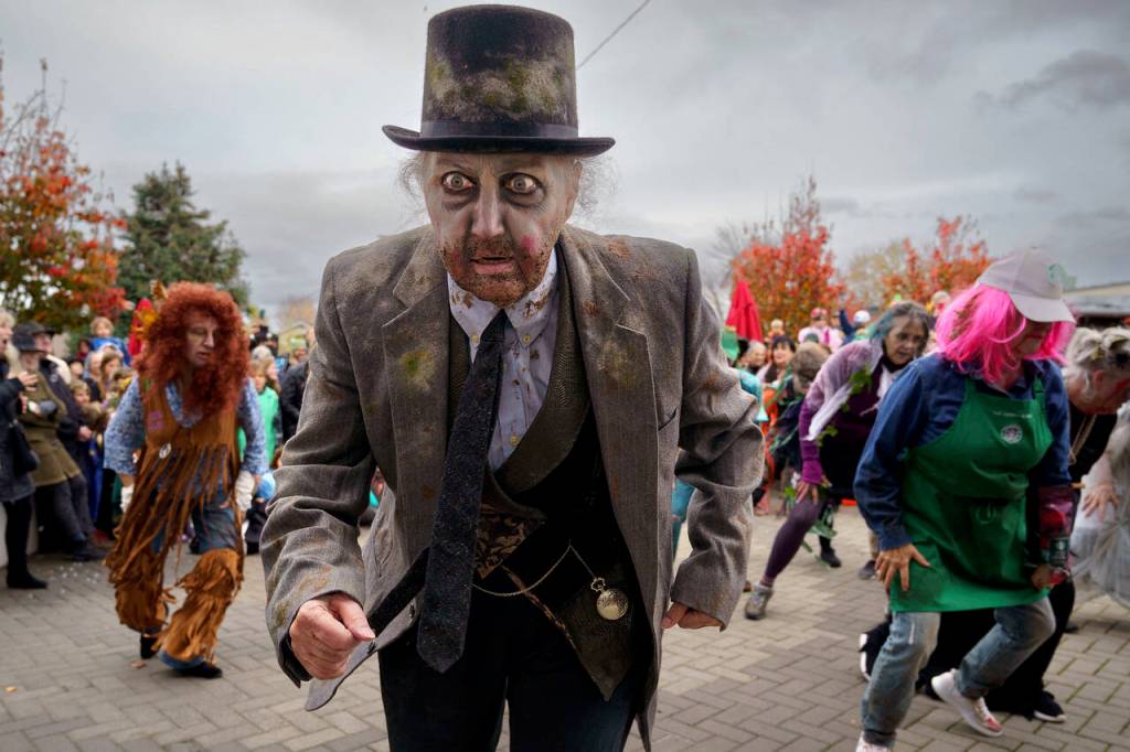 Island County Commissioner Melanie Bacon, nearly unrecognizable as a member of the undead, participated in a zombie flash mob Thursday afternoon in Langley. Both adults and kids in all sorts of creative costumes flocked to the downtown area to trick-or-treat on Halloween.