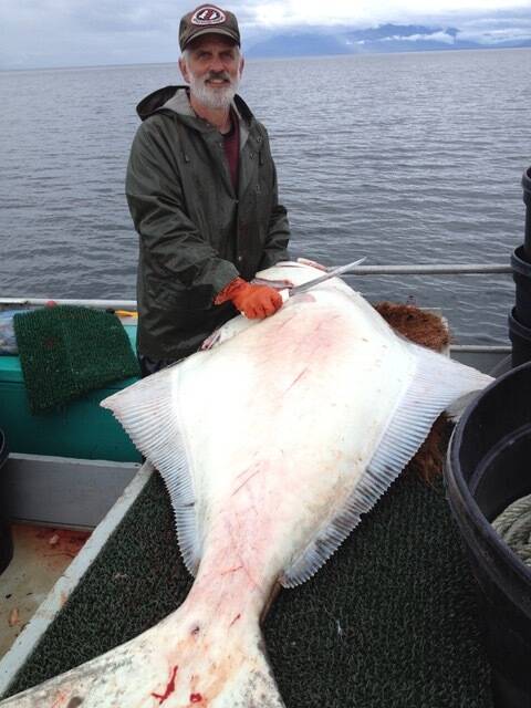 Kurt Hoelting, a longtime commercial fisherman in Alaska, with a massive halibut in Frederick Sound.