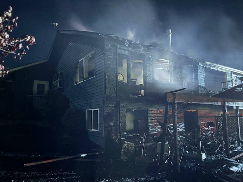 (Photo by South Whidbey Fire/EMS) A Clinton home suffered extensive damage when it caught fire early Tuesday morning. The residents were displaced but uninjured.