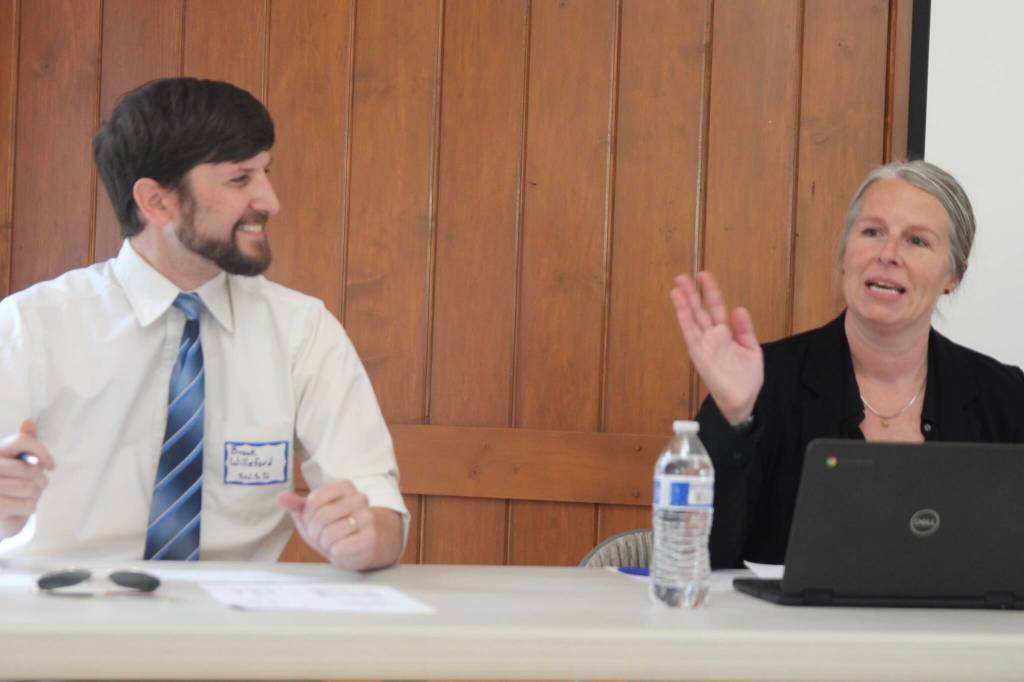 School board presidents Brook Willeford from South Whidbey school district and Morgan White from Coupeville school district discuss funding needs. (Photo by Marina Blatt)